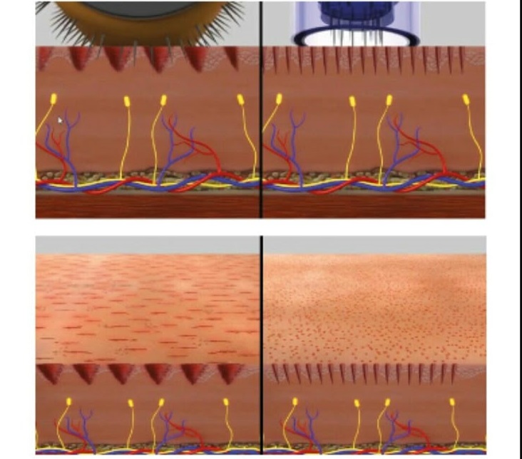 Rozdíl v narušení kůže: vlevo dermaroller a vpravo mikrojehličky