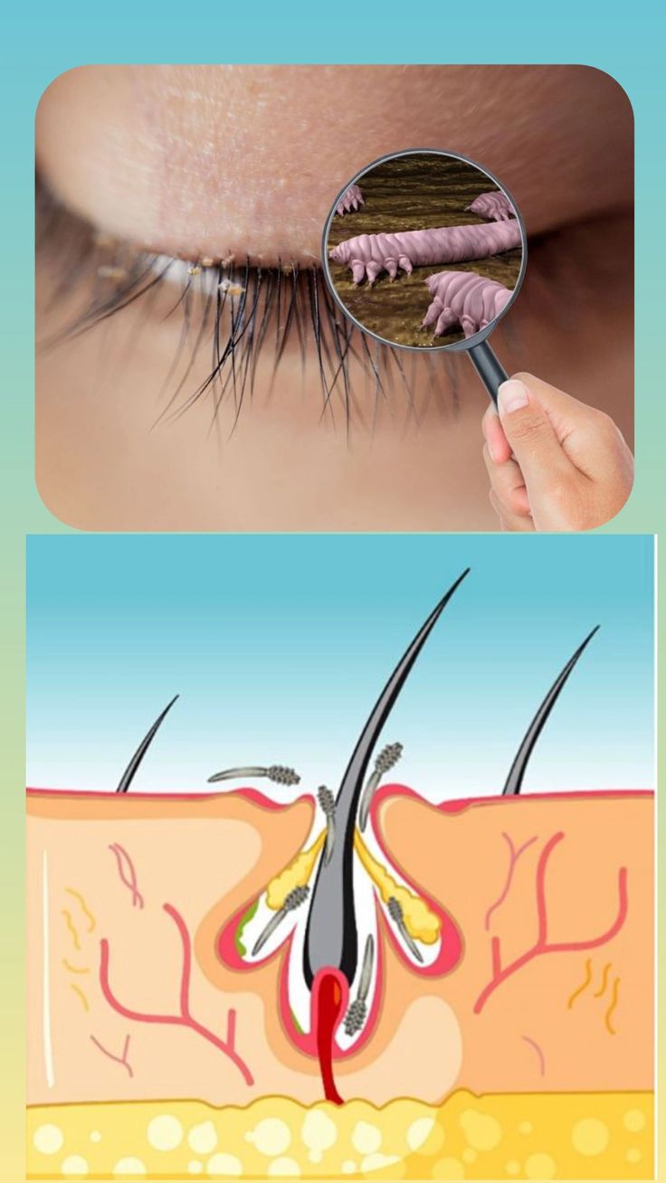 Je to mikroskopický roztoč, který žije přirozeně ve vlasových folikulech a mazových žlázách – hlavně kolem řas, obočí, nosu a úst.